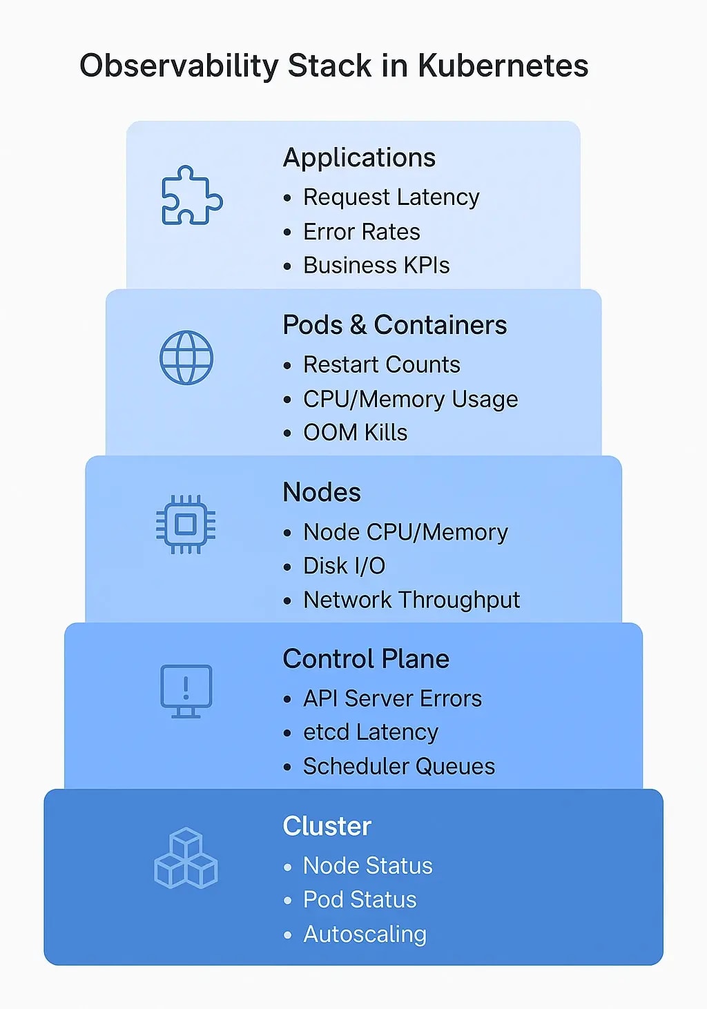 Finally, we reach the business logic that is the code you deploy. Application-level metrics include request latency, error rates, throughput, and custom business KPIs. These metrics help tie technical issues to user-facing problems, which is especially important when debugging customer-impacting incidents.
